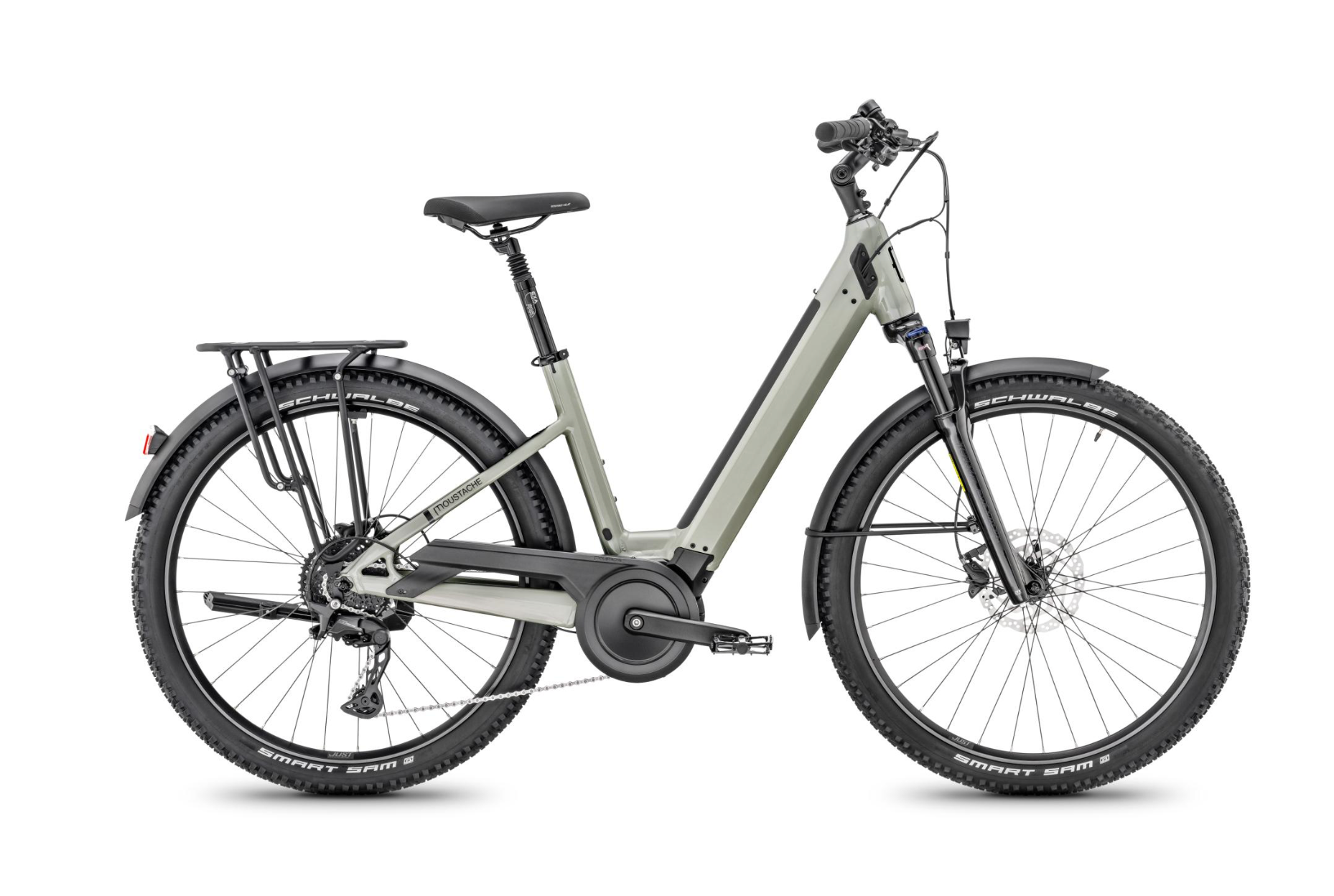 Équipements complets : Garde-boue aluminium, porte-bagages MIK HD, éclairages avant et arrière alimentés par la batterie.